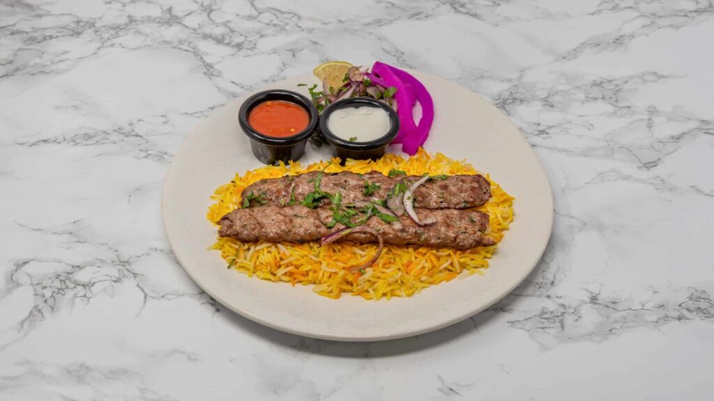 Charcoal grilled lamb mince (2 Skewers) seasoned with authentic Syrian spices