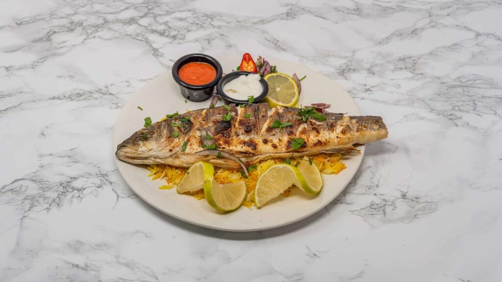 Charcoal-grilled whole seabass, crispy on the outside, tender inside