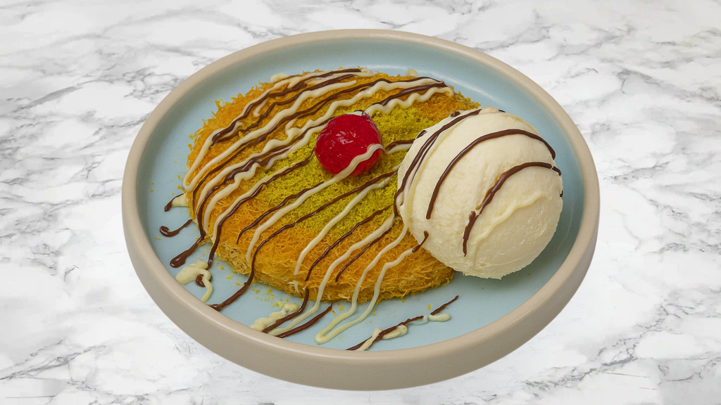 Sweet, crunchy kunafa served with cold, creamy ice cream