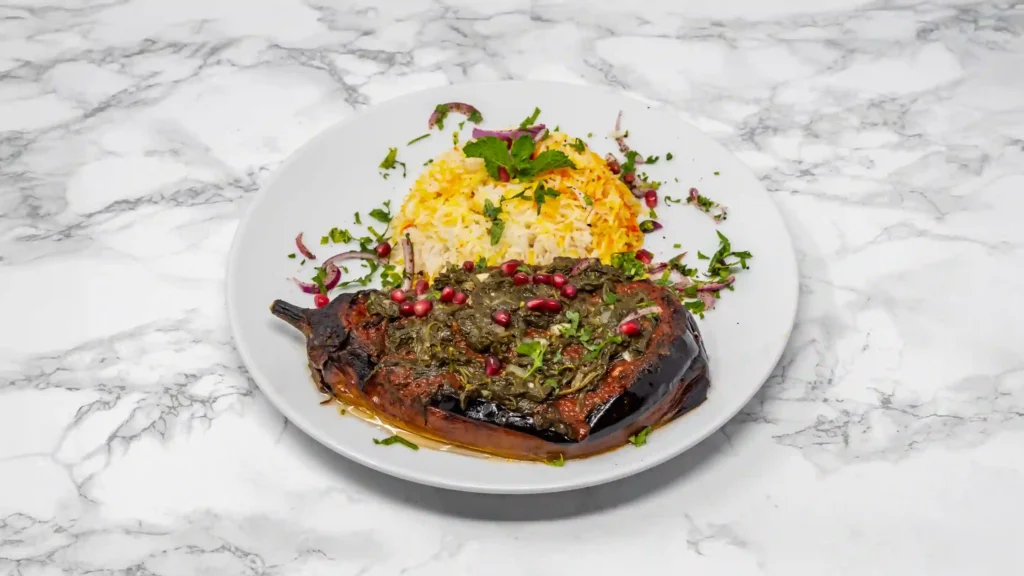 Aubergine filled with fresh spinach, mushrooms, and coriander, served with rice