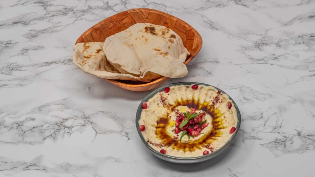Chickpeas, tahini, olive oil, arabic bread